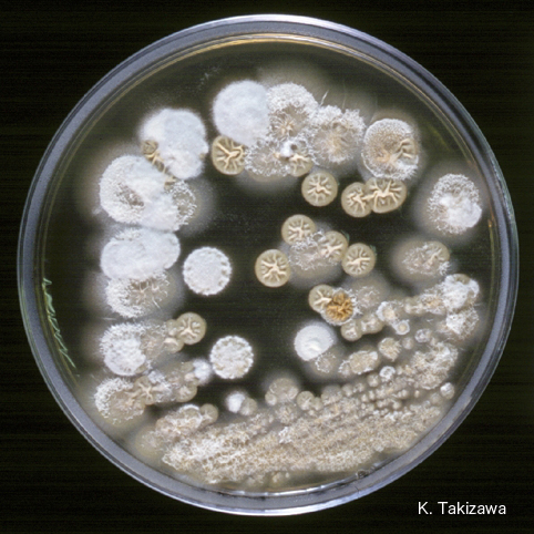 サブロー・デキストロース寒天,30℃,30日間培養.皺のある酵母様集落および 気菌糸を有する糸状集落が現れた.
