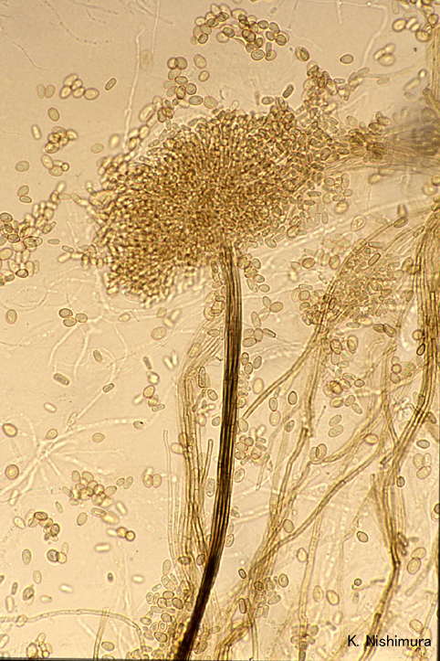 分生子柄束は数?数十本の褐色の分生子柄からなり,先端に無色~淡色, 円筒形の分生子の粘液塊をつける.