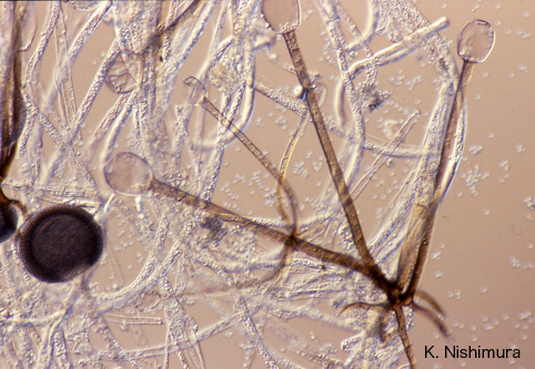 Sporangiophores are brown, unbranched, raising singly or in a small bunch from nodes with rhizoids. Columellae are subspherical or pyriform occupying a large part of the sporangium.