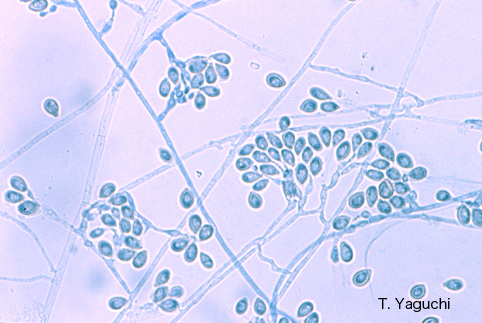 本菌種は長く伸びた先端を持つフラスコ形の分生子柄が特徴的である.